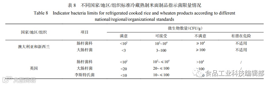 和菌落总数一样,国际食品微生物标准委员会、CAC、欧盟、美国、加拿大也均对包括冷藏熟制米面制品的即食食品强调过程控制,而不规定指示菌限量。澳大利亚、新西兰和英国将肠杆菌科和大肠杆菌作为指示菌,此外,英国还将李斯特氏菌(非单核细胞增生李斯特氏菌)作为指示菌,具体指标见表8。