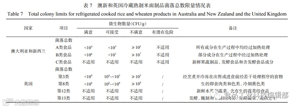 对于菌落总数,其他国家/地区/组织均强调过程控制,而不规定限量。对于熟制谷物制品,国际食品微生物标准委员会在“食品微生物丛书”第8卷《食品加工过程中的微生物控制-原理与实践》中指出肠杆菌科或菌落总数是过程控制的有用指示菌。对于涂层或夹心面团产品,需氧菌落计数和肠杆菌科是加工过程控制中适当的指示菌。国际食品法典委员会(Codex Alimentarius Commission,CAC)、欧盟、美国、加拿大也均对包括冷藏熟制米面制品的即食食品强调过程控制,而不规定菌落总数限量。
