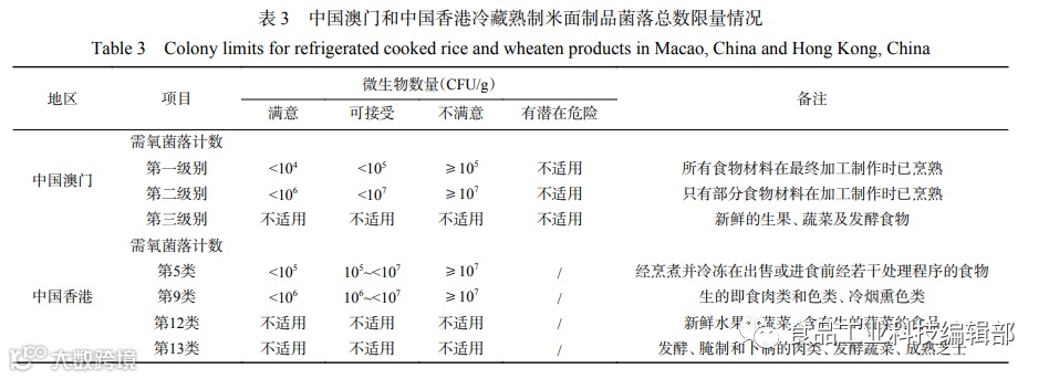 中国澳门参照了澳新标准,制定了《即食食品微生物含量指引》,对于微生物限量标准将检测结果分为满意、可接受、不满意和有潜在危害4种水平。中国澳门参照了澳新标准,也将食品分为了第一级别、第二级别和第三级别。具体各类食品4种水平的菌落总数限量情况见表3。中国香港参照了英国标准,在2014年修订了《食品微生物含量指引》,对于微生物限量标准将检测结果分为满意、可接受、不满意3种水平。中国香港对菌落总数规定较为严格,将即食食品分为14个类别对其菌落总数进行规定,具体指标见表3。
