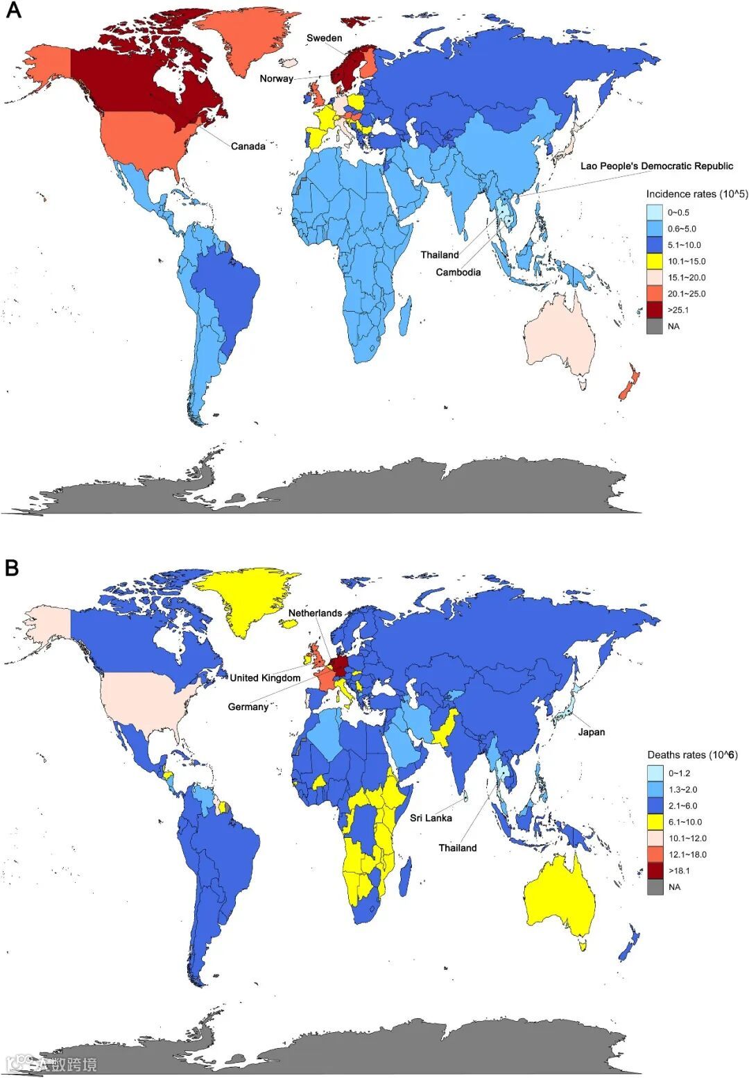 图1. IBD的全球流行趋势。(A) 发病率,(B)死亡率。