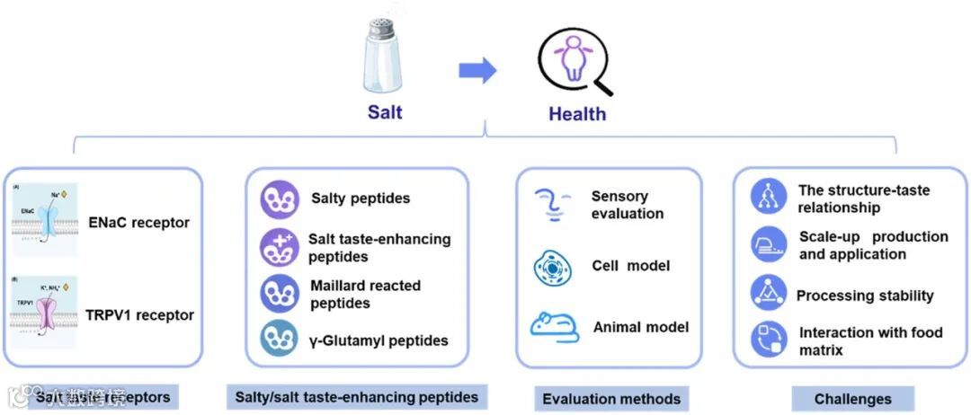 长期的高钠饮食消费在很大程度上与一些心血管疾病的发病机理有关。因此,非钠盐如氯化钾和氯化钙经常被用于食品工业,以部分替代氯化钠。但是过度使用这些替代品会对食品的感官品质产生负面影响。因此,咸味肽和咸味增强肽的研究、开发和应用作为一种潜在的减盐策略是很有前途的。