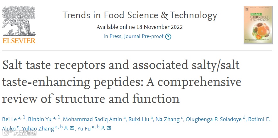 2022年11月18日,西南大学张宇昊教授*(通讯作者)、付余教授*(通讯作者)等在国际食品TOP期刊Trends in Food Science & Technology (Q1,IF: 16.001)(点击查询最新即时IF和分区)发表题为“Salt taste receptors and associated salty/salt taste-enhancing peptides: A comprehensive review of structure and function”的综述性论文。