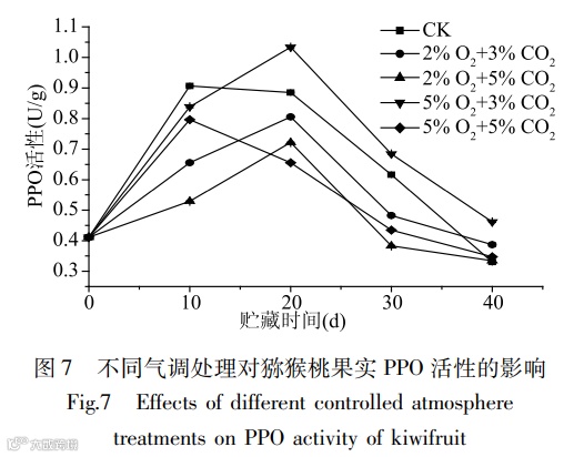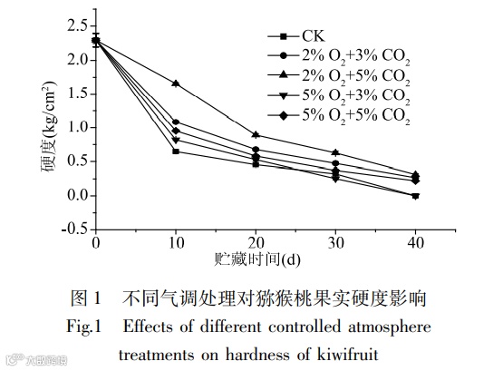 方法:将在温度为(4 ± 1) ℃,相对湿度为85% ± 5%的条件下充分预冷24 h后的“徐香”猕猴桃随机分成5组,分别贮藏于气体成分为2%O2+ 3%CO2、2%O2+ 5%CO2、5%O2+ 3%CO2、 5% O2+ 5%CO2的气调箱内,以空气作为对照组。每隔10 d取样一次,每次分别从各组中随机取15个猕猴桃,使用硬度计测定其各部位的硬度,使用数字折光仪测量其总可溶性固形物含量,采用2,6-二氯酚靛酚滴定法测定其维生素C(VC)含量,采用福林-酚比色法测定其总酚含量,采用硫代巴比妥酸比色法测定其丙二醛含量,采用愈创木酚法测定其过氧化物酶(peroxidase,POD)活性,采用邻苯二酚比色法测定其多酚氧化酶(peroxidase,PPO)活性,以上各指标均取3个平行样,重复3次,然后计算其均值,并运用Excel 2007和Origin 8.0软件对数据进行处理分析。