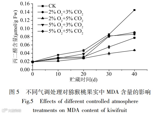 Results: By measuring the physiological indexes of "Xuxiang" kiwifruit during storage, it was found that when the gas composition was 2%O2+ 3%CO2, the aging degree of kiwifruit was more serious with the extension of storage period. When the gas composition was 5%O2+ 3%CO2, 5%O2+ 5%CO2 and 2%O2+ 5%CO2, kiwifruit could get better fresh-keeping effect during storage,the best atmosphere storage conditions of 2%O2+ 5%CO2 had the best fresh-keeping effect on kiwifruit, the fruit quality could be well maintained. At the end ofstorage, the hardness of 2%O2+ 5%CO2 group was the highest, while the kiwifruit of control group almost completely softened. The soluble solids contents of 2%O2+ 5%CO2 group was significantly higher than that of other groups (P<0.05), which was 10.5%. The VC contents of 2%O2+ 5%CO2 group was significantly higher than thatof control group (P<0.05), which was 218.41 mg/100 gand slowed down the decomposition speed of VC effectively. The decrease rate of total phenol contents of 2%O2+ 5%CO2 group was the slowest, which was 1.8 times higher than thatof control group. The MDA contents in kiwifruit stored with 2%O2+ 5%CO2 was significantly lower than that of other treatment groups (P<0.05), which wasjust 0.047 μmol/g·Fw, which could effectively reduce the accumulation of MDA in kiwifruitand the degree of membrane lipid peroxidation was reduced. The POD activity of 2%O2+ 5%CO2 group ranked first,the value of POD was significantly higher than that of other groups (P<0.05). The PPO activity of 2%O2+ 5%CO2 group was the lowest, the value of PPO was significantly lower than that of other groups (P<0.05), the browning rate of fruit was slowed down effectively.