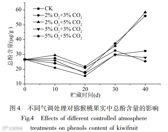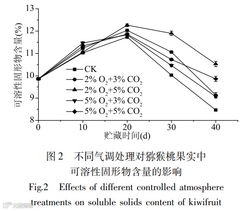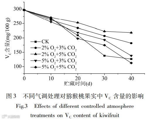 Methods: The "Xuxiang" kiwifruit after fully precooling for 24 h at (4±1) ℃and a relative humidity of(85%±5%)were randomly divided into 5 groups, and stored in the controlled atmosphere chamber with gas components of 2%O2+ 3%CO2, 2%O2+ 5%CO2, 5%O2+ 3%CO2 and 5%O2+ 5%CO2, the air was used as the control group. Fifteen kiwifruit were randomly selected from each group every 10 days, the hardness of each part wasmeasured by a hardness tester, the total soluble solid contentswas measured by digital refractometer. The vitamin C (VC) contents was determined by 2,6-dichlorophenol indophenol titration, the total phenol content was determined by Folin phenol colorimetry, the malondialdehyde (MDA) contentswas determined by thiobarbituric acid colorimetry, the peroxidase (POD) activity was determined by guaiacol method, the polyphenol oxidase (PPO) activity was determined by catechol colorimetry. Three parallel samples were taken for all indicators, repeated for 3 times, then calculated their mean value, the data were processed and analyzed by Excel 2007 and origin 8.0 software.