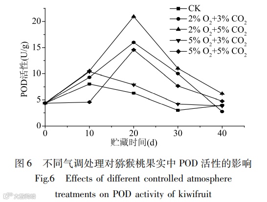 Conclusions: The controlled atmosphere storage condition of 2%O2+ 5%CO2 has the best fresh-keeping effect on "Xuxiang" kiwifruit. During storage, it can effectively maintain the hardness of kiwifruit, delay the decline of soluble solids content, VC content and total phenol contents, inhibit the decline of POD activity, maintain low PPO activity and MDA content, promote the antioxidant system of fruit tissue to remain perfect, delay the senescence rate of fruit, maintain the best quality of fruit and prolong the supply period of fruit market. This study have a good application prospect in the storage and preservation of kiwifruit.