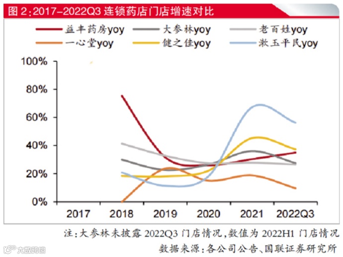 老百姓、益丰药房、大参林、漱玉平民分别于2016年、2017年、2019年、2020年开始通过加盟模式实现快速扩张。据国联证券研报及上市连锁年报,截至2022年9月底,老百姓、益丰药房、大参林、漱天平民的加盟店数量分别为2965家、1753家、1376家、1535家,占当时各家连锁的门店总数比例分别为28.71%17.92%、15.47%、33.13%。最高的已达1/3,最少的也接近两成。