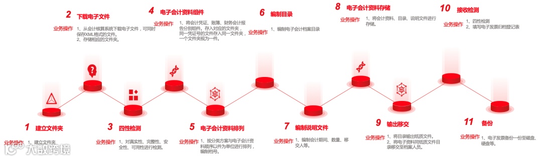 在发票管理过程当中,从发票的开具到发票的接收——>报销——>用途确认——>入账——>收集整理归档——>档案保管——>档案利用、鉴定、处置,在各个环节当中管理的要求与实践执行方式如下。