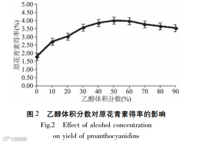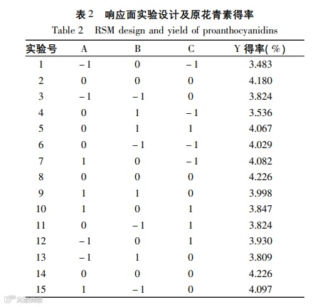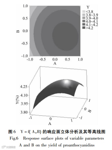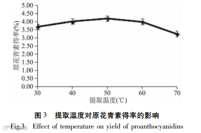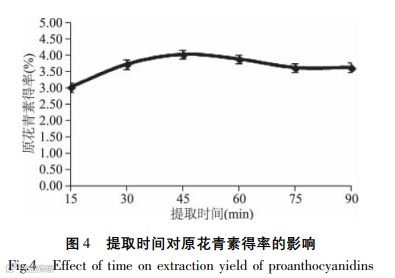 Conclusions: The single-factor and RSM was used to establish the quadratic polynomial fitting equation and three-dimensional response surface diagram of proanthocyanidin yield. The conditions of proanthocyanidin extraction were optimized by this model, of which the ethanol concentration was 55.60%, extraction temperature was 45.77 °C and extraction time was 48 min. Finally the yield of proanthocyanidins could reach to 4.315% and was higher than recorded yield 2.990%.