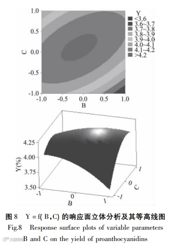 Results: In single-factor experiments, the maximum yield of proanthocyanidins was got at ethanol concentration of 50%. Although higher temperature could promote the dissolution of proanthocyanidins, it could also inactivate it. With the increasing of temperature, the yield decreased gradually. In range of 40~60 min, yield increased along with prolongation of time, and then kept stable after the maximum. Accompanied with the improving of solid to liquid ratio, yield of proanthocyanidins increased, and then became stable at the ratio of 1:20 g/mL. Based on the above results, in the Box-Behnken center combination experiment, ethanol concentration of 40%, 50% and 60%, extraction temperature of 40, 50 and 60 °C, extraction time of 40, 50 and 60 min were separately selected as parameter level of -1, 0 and 1. Experiments were designed and analyzed by Minitab 17 software, the regression equation was Y=4.2107+0.1223A-0.0455B+0.0673C-0.1536A2-0.1251B2-0.2216C2-0.0210AB-0.1705AC+0.1840BC, R2=99.20%. This equation fitted well with the actual situation, and could be used to analyze the experimental results instead of actual point of experiment. The linear and quadratic terms of the regression equation had significant influences on yield. Combined with the response surface diagrams, the significance order of three parameters on response value was A>C>B, the interaction terms AC and BC had significant effects on response value, while the interaction terms AB had no significant. The maximum yield of proanthocyanidins was 4.250%, which was reached at ethanol concentration of 55.60%, extraction temperature of 45.77 °C, and extraction time of 47.612 min. Considering the practical feasibility, three parallel verification experiments were carried out under ethanol concentration of 56%, extraction temperature of 46 °C, and extraction time of 48 min, for which the yields were seperately 4.308%, 4.312% and 4.325%, average of 4.315%. Its relative error with predicted value was 1.5%, and the theoretical value fitted by the response regression equation had small deviation from the actual value.
