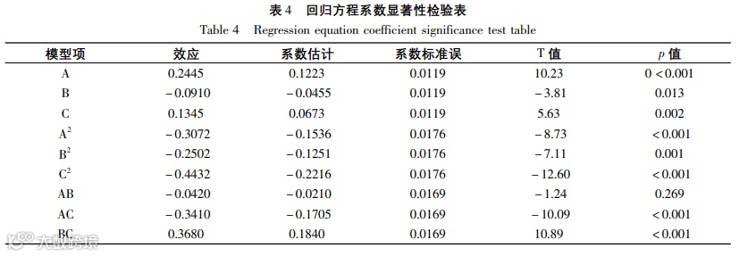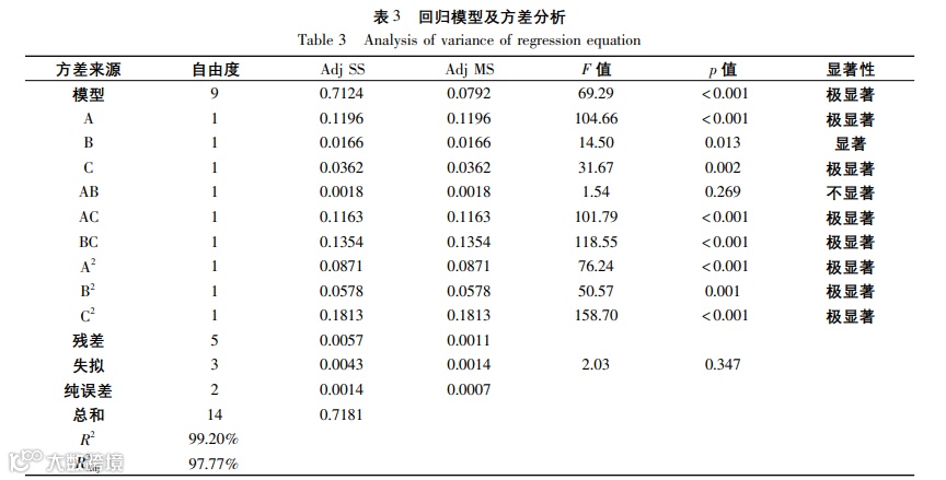 结果:单因素实验中,原花青素得率最高时的乙醇体积分数为50%;高温虽然能促进原花青素的溶出,但同时也会使其失活,温度在50 ℃以下时,原花青素得率呈现上升的趋势,随着温度的增加得率逐渐下降;提取时间为40~60 min时原花青素得率随时间的延长而增加,但当得率达到最高水平时,继续延长提取时间得率趋于平稳;原花青素得率先随着料液比的增加而升高,料液比达到1:20 g/mL时,原花青素得率趋于平稳。基于以上结果,在Box-Behnken中心组合实验中,选取乙醇体积分数40%、50%、60%,提取温度40、50、60 ℃,提取时间40、50、60 min,分别设定为-1、0、1三个水平的因素值,借助Minitab 17设计实验方案,将实验结果进行回归分析,对各因素拟合后得到回归方程:Y=4.2107+0.1223A-0.0455B+0.0673C-0.1536A2-0.1251B2-0.2216C2-0.0210AB-0.1705AC+0.1840BC,该回归模型的R2=99.20%,与实际拟合良好,可代替实验真实点对实验结果进行分析。该回归方程的一次项和二次项的影响显著,结合响应面图判定各因素对响应值显著性的排序为A>C>B;交互项AC和BC对响应值影响也极显著,但A和B二者交互对响应值的影响不显著。对回归方程求解,即得率达到最大值时的提取条件为乙醇浓度为55.60%, 提取温度为45.77 ℃,提取时间为47.612 min,此时原花青素得率为4.250%。结合实际操作可行性,在乙醇浓度56%,提取温度46 ℃,提取时间48 min条件下,取三等份黑果枸杞进行原花青素提取的平行验证实验,得率分别为4.308%、4.312%、4.325%,平均得率为4.315%,与预测值相对误差为1.5%,经过响应回归方程拟合出的理论值与实际值偏差小。