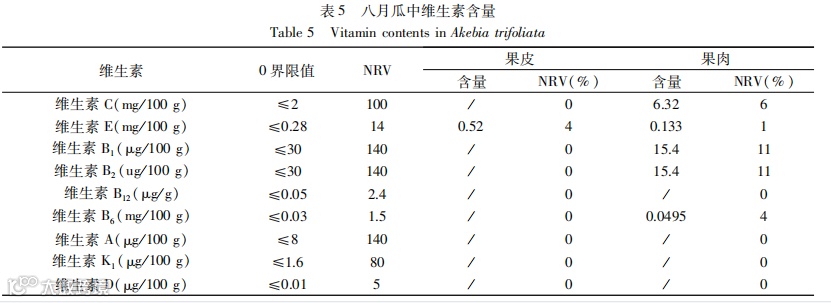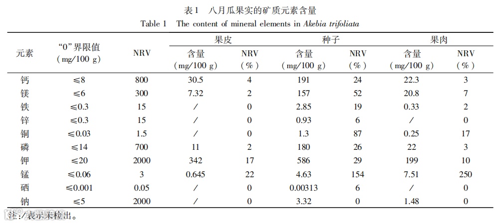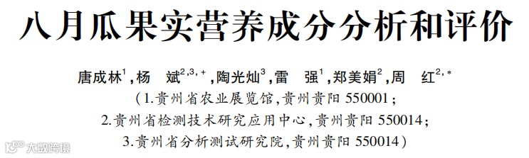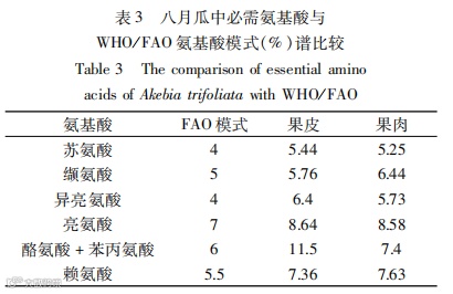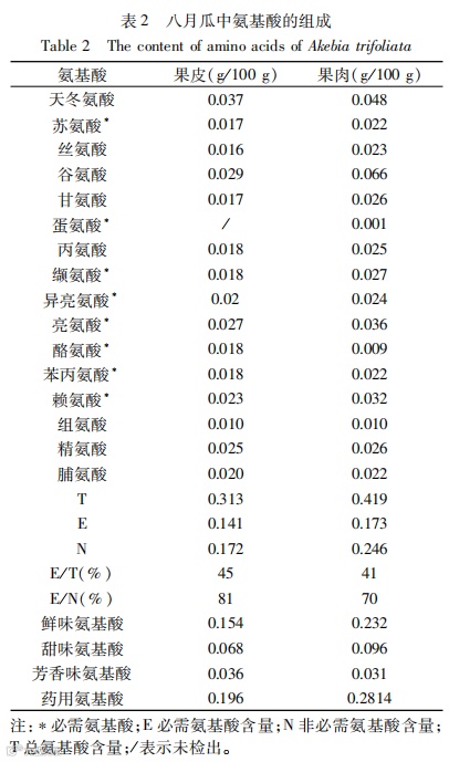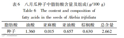摘要:本文用火焰原子吸收光谱法、液相色谱法、荧光分光光度法等实验方法对八月瓜果皮、果肉和种子中营养物质成分进行检测分析。基于检测分析可知,八月瓜果实具有很高的营养价值。其中,八月瓜果皮含有锰、钾矿物质营养成分,含量分别为0.645、0.342 mg/100 g;八月瓜果皮总氨基酸含量为0.313 g/100 g,含15种氨基酸,其中必需氨基酸7种,必需氨基酸比重达到WHO/FAO提出理想蛋白质条件,必需氨基酸含量不及果肉均衡,营养价值比果肉低;含有少量的维生素E、果胶、蛋白质和脂肪。八月瓜种子含有多种矿物质营养成分,即含钾、磷、钙、铁矿物质营养成分,含量分别为586、180、191、2.85 mg/100g;八月瓜种子富含多种矿物质营养成分,即富含锰、铜、镁矿物质营养成分,含量分别为:4.63、1.3、157 mg/100g;脂肪酸含量为2.662 g/100g,不饱和酸含量比重为76%。八月瓜果肉含有铜矿质营养成分,含量为0.25 mg/100 g;富含锰矿物质营养成分,含量为7.51 mg/100g;八月瓜果肉总氨基酸量含量为0.419 g/100 g,含16种氨基酸,其中必需氨基酸8种,必需氨基酸比重达到WHO/FAO提出理想蛋白质条件,必需氨基酸含量均衡,营养价值高;含有少量的维生素、脂肪、蛋白质和黄酮。