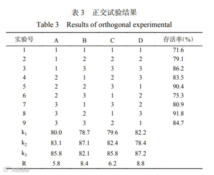 由单因素实验可以看出,脱脂乳、海藻糖、山梨醇和甘油作为冻干保护剂能明显提高植物乳杆菌冻干菌种细胞的的存活率,但保护剂单独使用时,植物乳杆菌冻干后细胞最大的存活率只能达到65.20%,为了进一步提高植物乳杆菌冻干菌种的存活率,实验以单因素实验确定的脱脂乳6%,海藻糖2%,山梨醇2%,甘油3%为中心点,采用四因素三水平的正交实验,研究脱脂乳、海藻糖、山梨醇和甘油四种保护剂联合使用时,保护剂的最佳配比,正交实验结果见表3。