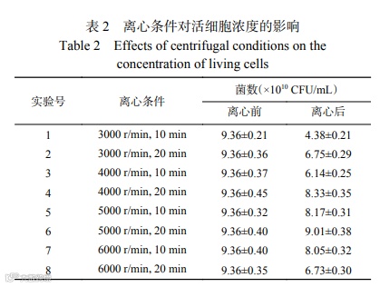 离心是发酵剂制备的关键工艺环节,因此实验研究了离心转数及时间对收获的活细胞浓度的影响见表2。
