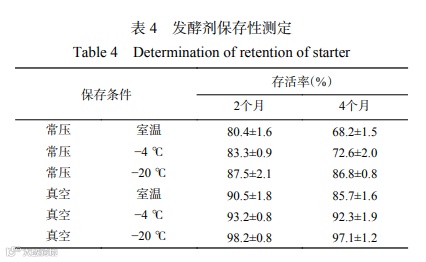 将真空冷冻干燥后的植物乳杆菌G1-28发酵剂,装入经灭菌处理的铝箔聚酯复合袋内,分别采用真空和常压包装,在−20、−4 ℃和室温下分别保藏2个月和4个月,进行平板菌落计数,测定植物乳杆菌细胞存活率,实验结果见表4。