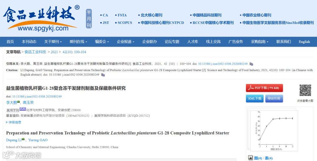 目前,嗜酸乳杆菌等益生菌的冻干存活率普遍不高,为了提高益生菌的冻干存活率,提高益生菌的保藏效果,李大鹏团队以前期从传统腊肠中筛选的具有体外降胆固醇和降甘油三酯功能的益生菌植物乳杆菌G1-28为研究对象,对菌体离心条件、冻干保护剂的选择及其复配及其冻干菌剂的保藏条件进行了系统的研究,为益生菌植物乳杆菌G1-28高活性冻干发酵剂的制备奠定基础。