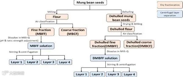 本文采用温和的绿豆纯化方法,通过研磨和空气分级获得富集蛋白质的细粒部分(MBFF)和去壳富集蛋白质的细粒部分(DMBFF),然后溶解和离心以增加蛋白质含量。同时研究了基本工艺参数分类转速、脱壳、搅拌时间、pH值和盐的添加对蛋白提取和蛋白质功能的影响。