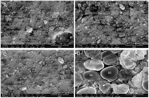 结果1:基于扫描电子显微镜来确定两种方法处理后绿豆的性质,如图3所示。总的来说,在干燥分选后,破碎的绿豆种子细胞中可以释放出大量的卵圆形淀粉粒和一些比淀粉粒小得多的蛋白质体。蛋白质体的尺寸要小得多,在图3D所示的高倍放大图像中可以更好地识别。