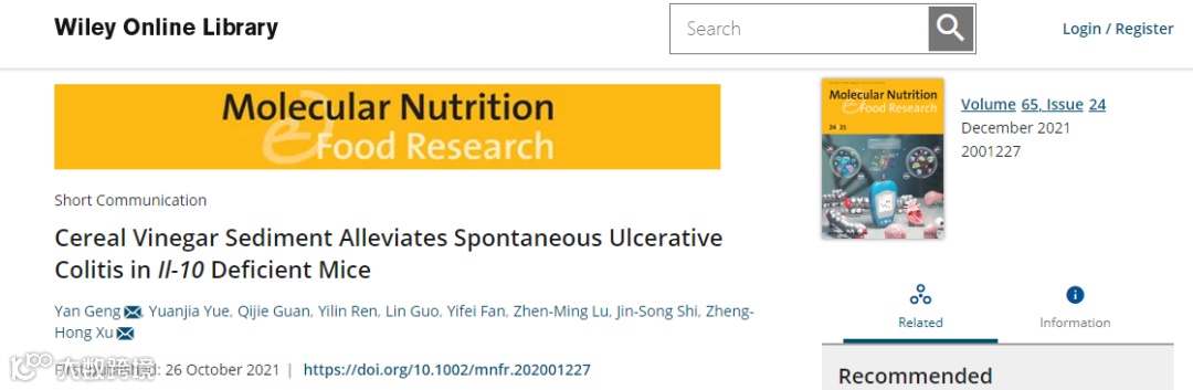 近期,江南大学生物工程学院许正宏教授团队在谷物醋膏抗炎作用机制相关研究取得重要进展,研究成果 “Cereal Vinegar Sediment Alleviates Spontaneous Ulcerative Colitis in Il-10 Deficient Mice”正式发表于《Molecular Nutrition & Food Research》。