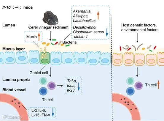 传统食醋在我国有着上千年的历史,多以高粱、大米、糯米等谷物为原料经多种微生物发酵而成,采用传统发酵酿造工艺,经过多道生产工序,可产生独特风味且含丰富的成分的功能食品。谷物醋膏(CVS)是谷物酿造传统食醋在保存过程中产生的沉淀物,富含蛋白、有机酸、多糖,多酚和黄酮等物质。该文章研究了 CVS 对 Il-10基因敲除小鼠自发性结肠炎的影响。研究发现 CVS 减轻了结肠炎小鼠肠道上皮损伤,抑制了髓过氧化物酶 (MPO) 活性和丙二醛 (MDA) 水平,降低了结肠组织中炎症因子 Tnf-α、Inos、Il-23 的基因表达。CVS 还抑制结肠炎小鼠血清中炎症因子 IL-2、IL-6、IL-13、G-CSF、GMCSF、IFN-γ 和 RANTES 的分泌。CVS增强结肠炎小鼠肠道组织抗菌肽Reg3γ表达,促进粘蛋白Muc2、Muc3和Muc4基因表达及Muc-2蛋白表达,并增加肠道内乙酸含量。此外,CVS 通过增加肠道潜在有益菌 Akkermansia、Alistipes 和 Lactobacillus 的丰度,同时抑制潜在有害菌 Desulfovibrio 和 Clostridium sensu stricto 1 来改变肠道微生物群的组成,这些变化或可影响机体类固醇、脂肪酸和胆汁酸的调控。