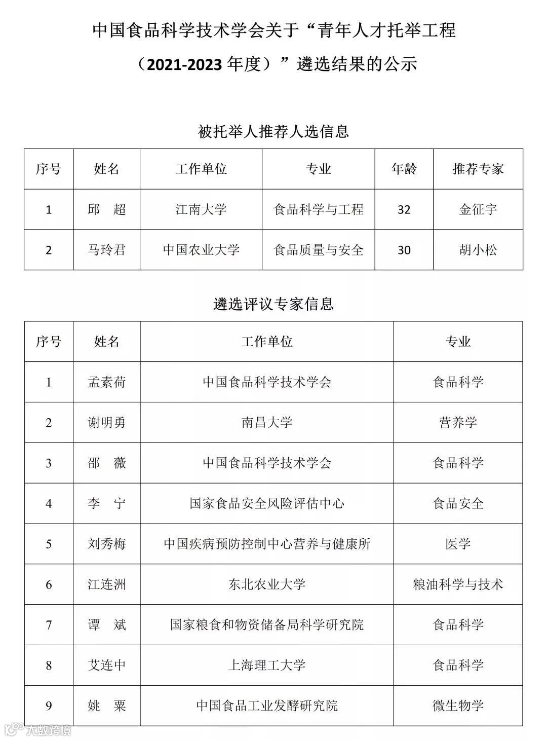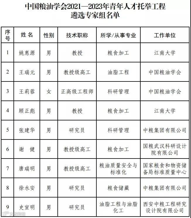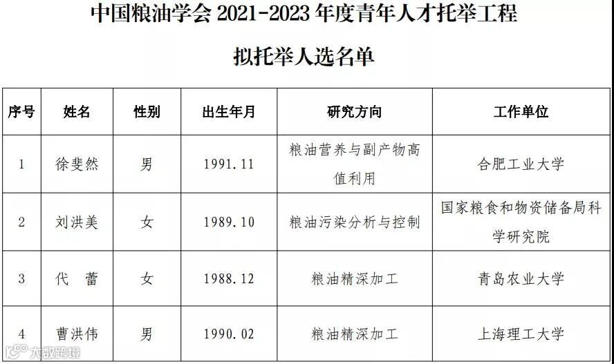 近日,中国食品科学技术学会和中国粮油学会公布了第七届(2021-2023年度)中国科协青年人才托举工程遴选结果,共计6位青年食品学者入选。具体名单见下表。