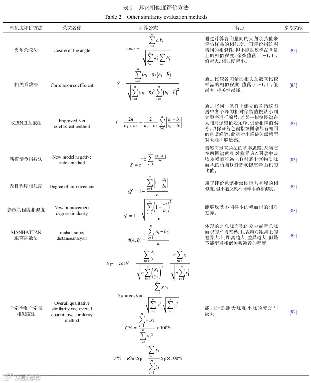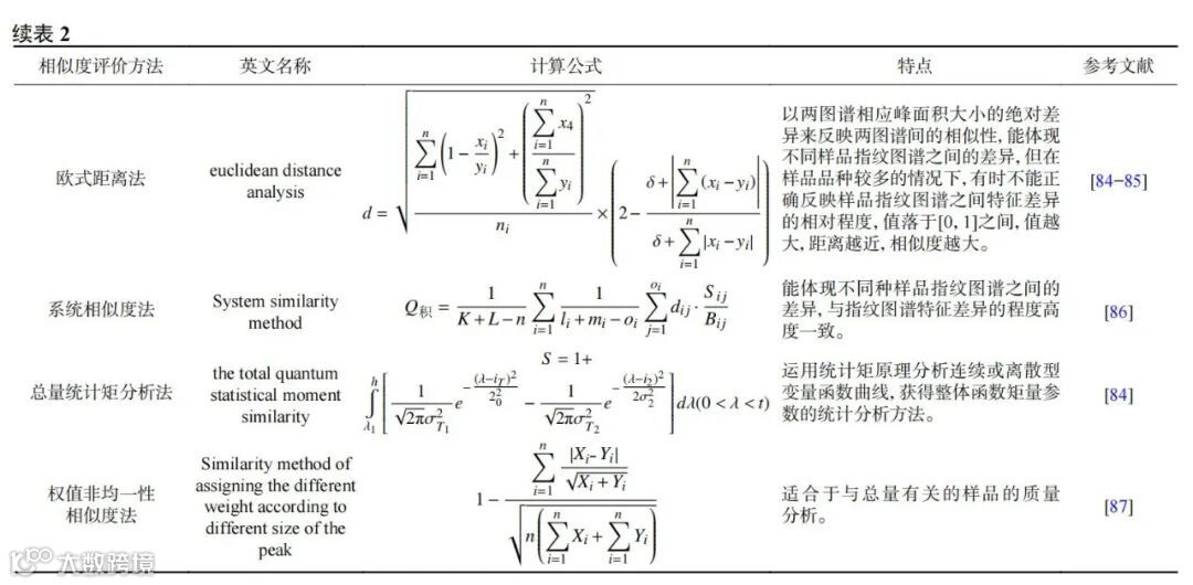 其它相似度评价方法如表2所示,表内方法均有其适用情况,并非在指纹图谱相似度评价中全部适用,需要科研工作者不断进行试验和筛选,以选择不同情况下最为合适的评价方法。应用较多的为夹角余弦法、系统相似度法和全定性和全定量相似度法。谢建军等采用夹角余弦法计算了85份红葡萄酒样品和3种勾兑葡萄酒样品的气相色谱指纹图谱的相似度,结果表明红葡萄酒指纹图谱的相似度大于0.9700,勾兑葡萄酒指纹图谱相似度均小于0.6128,可判断它们为假葡萄酒,此法能为葡萄酒的真假鉴别提供可靠的依据。孙国祥等采用全定性和全定量相似度法评价了甜瓜蒂的毛细管电泳指纹图谱,结果表明该方法能同时监测指纹图谱大峰和小峰的变动与缺失,可解决指纹图谱的宏观定性和定量评价问题,实现了对甜瓜蒂宏观定性定量的质量控制。可以看出,相似度评价方法是对指纹图谱进行方法学验证时必不可少的工具,可判断所建立的方法是否准确、可靠。