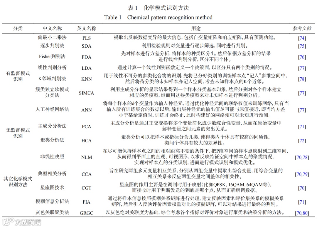 化学模式识别是将数理统计学、计算机信息技术与化学图谱解析结合起来的整合技术,往往基于色谱、光谱及其联用技术,利用计算机对食品所含的化学成分进行描述、分析、分类和识别。化学模式识别方法包括有监督模式识别、无监督模式识别以及其它化学模式识别方法,具体分类见表1。