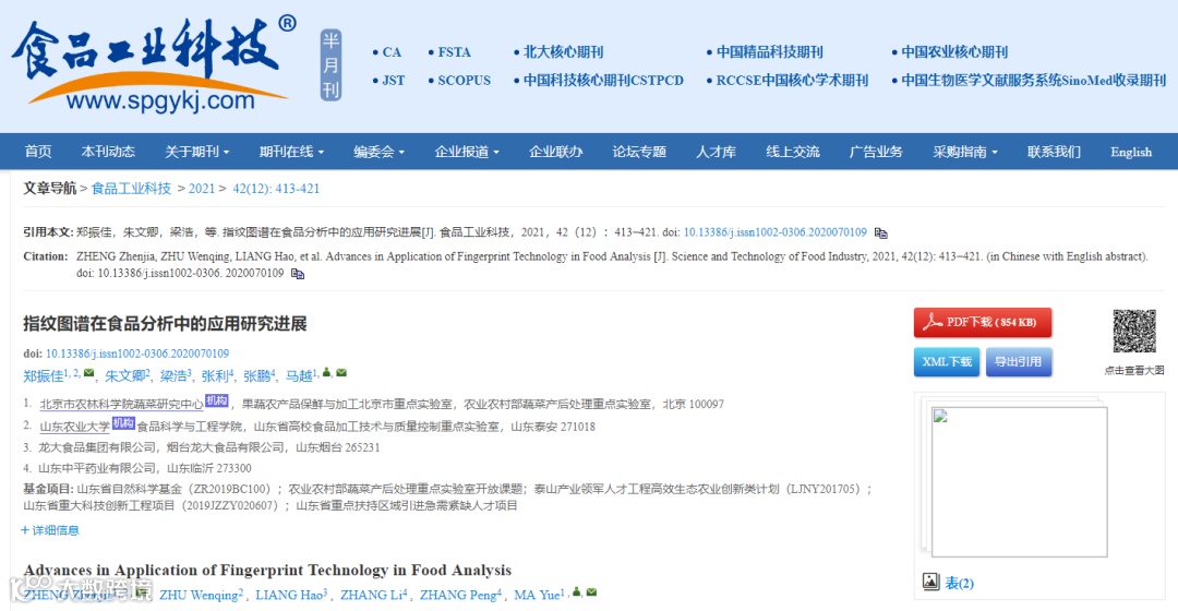 指纹图谱是基于食品的固有品质特性,运用光谱、色谱等现代仪器检测得到的能反映该食品内部特征的图谱,具有整体性、系统性、特征性和稳定性的特点。指纹图谱结合色谱和光谱等技术能够获得食品化学成分的特征谱图,是食品产地鉴别、真伪鉴别、优劣鉴别的有效工具,还可用于生产过程的质量控制:追踪化学成分的变化、监测各批次产品质量的一致性和稳定性。此外,食品指纹图谱可以用于探究基因型、遗传多样性及品种选育等领域,对食品各个方面的分析评价都具有重大意义。马越团队以指纹图谱常用的技术手段和分析方法为依据分类阐述近年来指纹图谱在各类食品质量控制与分析评价中的研究进展并对其在食品中的发展进行展望,以期指纹图谱能为食品质量控制、食品的现代化和国际化发展提供参考。