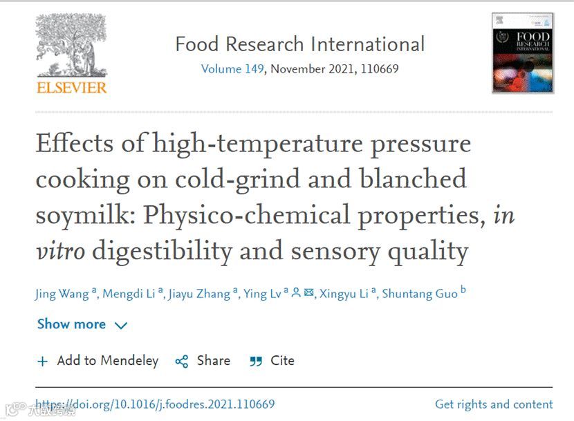 豆乳是以大豆为原料,经过浸泡、磨浆、过滤及煮浆等工艺加工而成的产品。冷磨豆乳加工过程中脂肪氧化酶催化不饱和脂肪酸氧化产生豆腥味,热烫豆乳常采用热烫湿豆的方法灭活脂肪氧化酶降低豆腥味。煮浆是豆乳生产中的必要环节,传统方法在常压(95 ℃-100 ℃)下通过热交换提高豆乳的温度,但工业化生产中常压煮浆会出现受热不均匀的现象。相比之下,微压煮浆(100 ℃-120 ℃,0.1 Mpa ~0.2 Mpa)的生产效率大大提高。然而,微压煮浆对两种豆乳蛋白质空间结构和消化性的影响尚不清楚。因此,作者以常压冷磨豆乳、常压热烫豆乳、微压冷磨豆乳和微压热烫豆乳为对象,研究了不同热处理豆乳蛋白质的微观结构、化学交联、内源性荧光和傅里叶变换红外光谱等变化,讨论了蛋白质结构变化对其体外消化率的影响。并在《Food Research International》杂志发表了“Effects of high-temperature pressure cooking on cold-grind and blanched soymilk: physico-chemical properties, in vitro digestibility and sensory quality”文章。本文由北京农学院和中国农业大学共同完成。第一作者Jing Wang(王京),为北京农学院食品科学与工程在读硕士研究生,通讯作者Ying Lv(吕莹),为北京农学院食品科学与工程学院副教授,Shuntang Guo(郭顺堂)为中国农业大学食品科学与营养工程学院教授,多年从事大豆加工与营养研究。本研究得到了北京市教委-北京市自然科学基金(KZ201910020023)的支持。