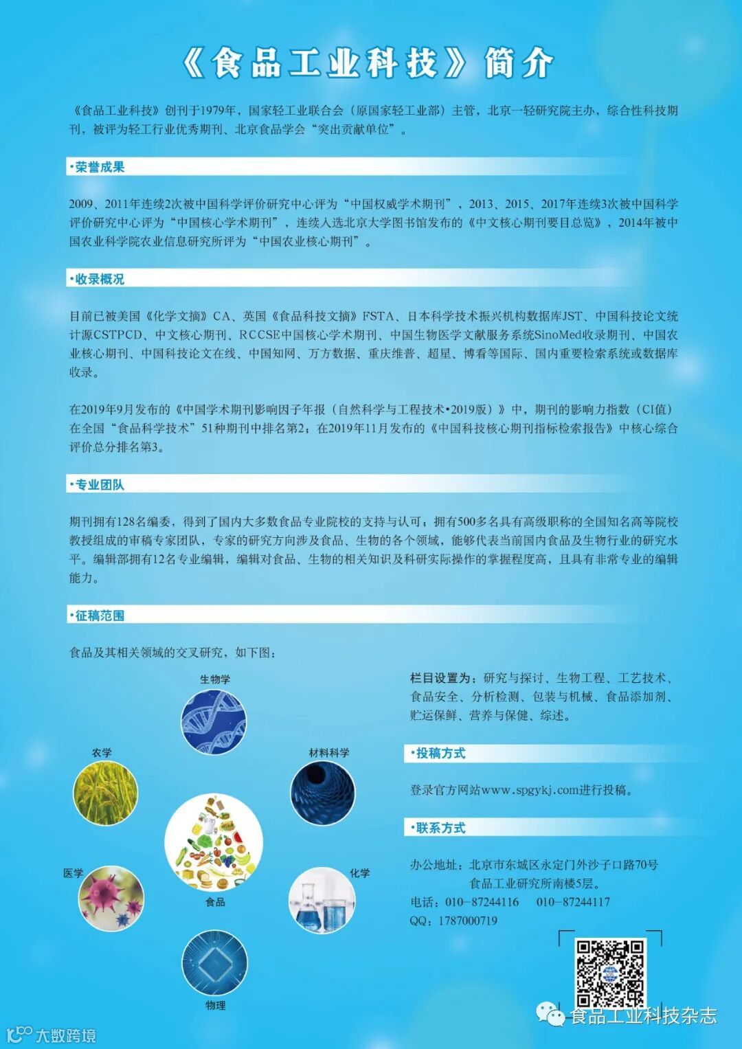 《食品工业科技》编辑部与作者、读者的交流平台。《食品工业科技》既是反映当前国内外食品工业技术水平的窗口,又是新技术应用推广的桥梁,面向科研、生产,满足各层次需求。