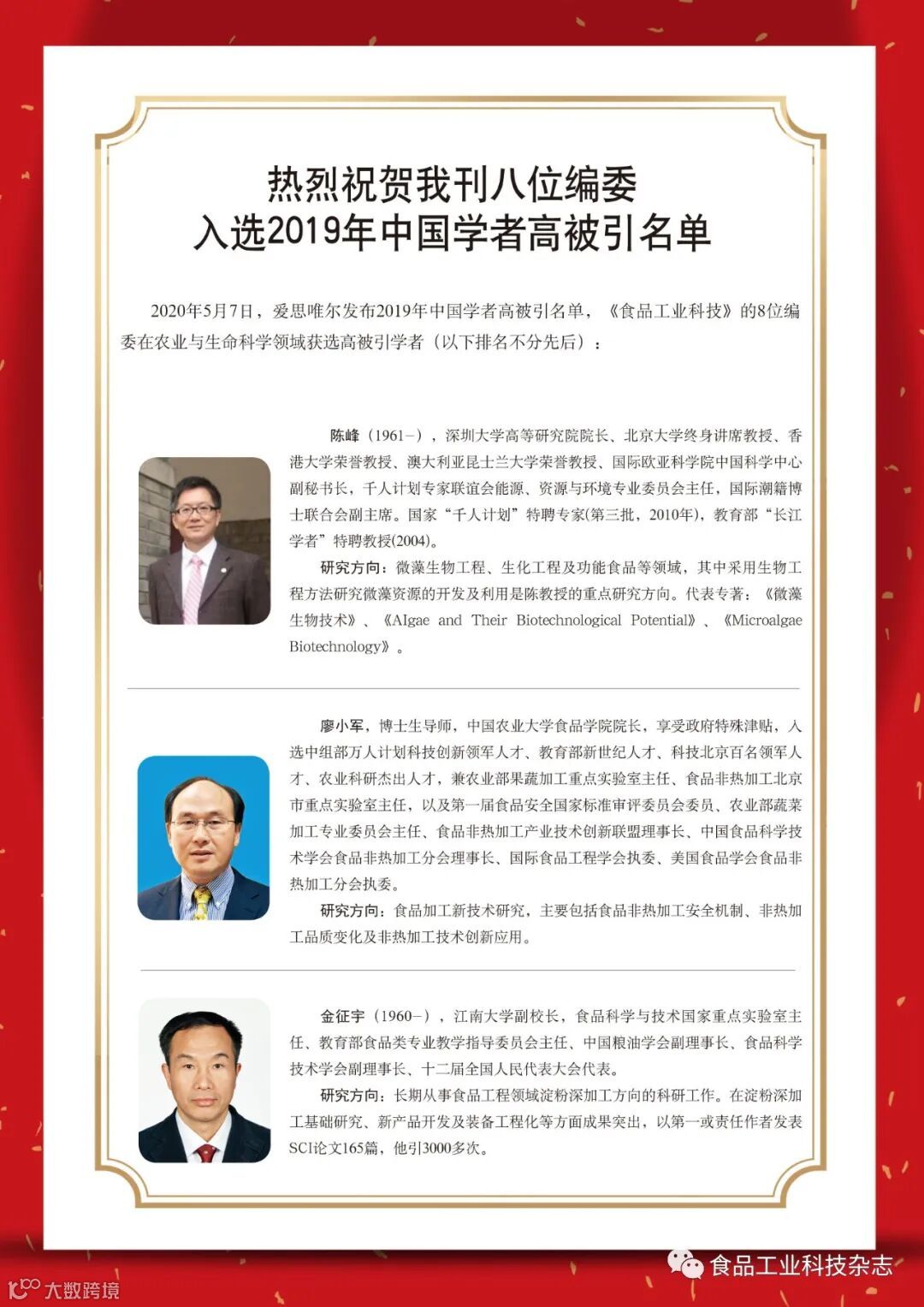 2020年12期特殊版位:热烈祝贺我刊八位编委入选2019年中国学者高被引名单