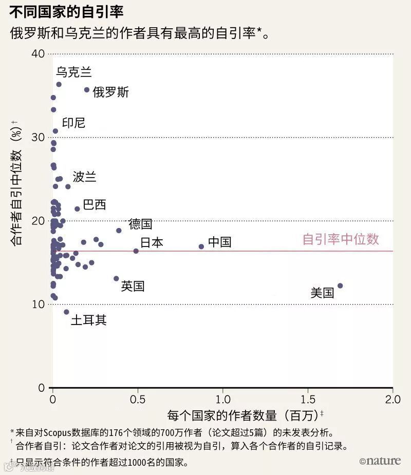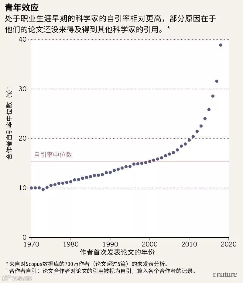 在这个数据库中,自引率中位数是15.5%,但是7%的作者的自引率超过40%,这个数据比最高引的科学家还大,因为在这700万人中,大多数人只有一丁点他引,或刚刚开始职业生涯。处于职业生涯早期的科学家的自引率会更高,因为他们的论文还没有足够的时间来累积他人的引用(见“青年效应”)。