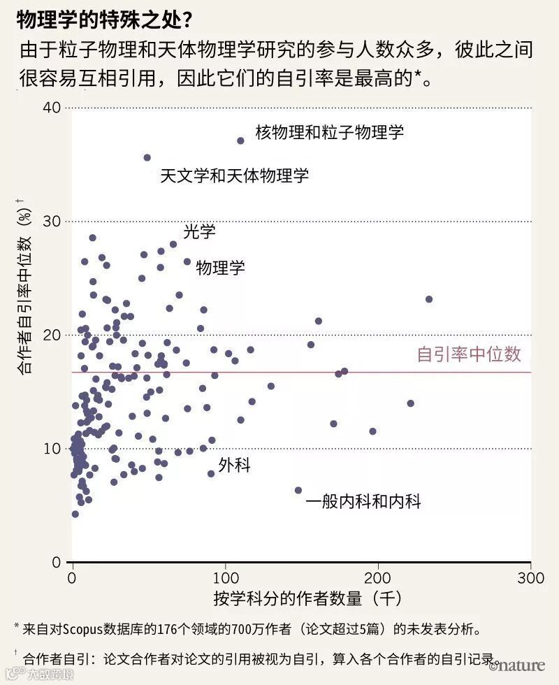 根据Baas的数据,俄罗斯和乌克兰的自引率中位数遥遥领先(见“不同国家的自引率”)。他的分析还表明,某些领域的自引率很高,比如核物理和粒子物理,以及天文学和天体物理学,这是因为这些领域论文的合作者特别多(见“物理学的特殊之处?”)。Baas表示,他并不打算公开这些数据。