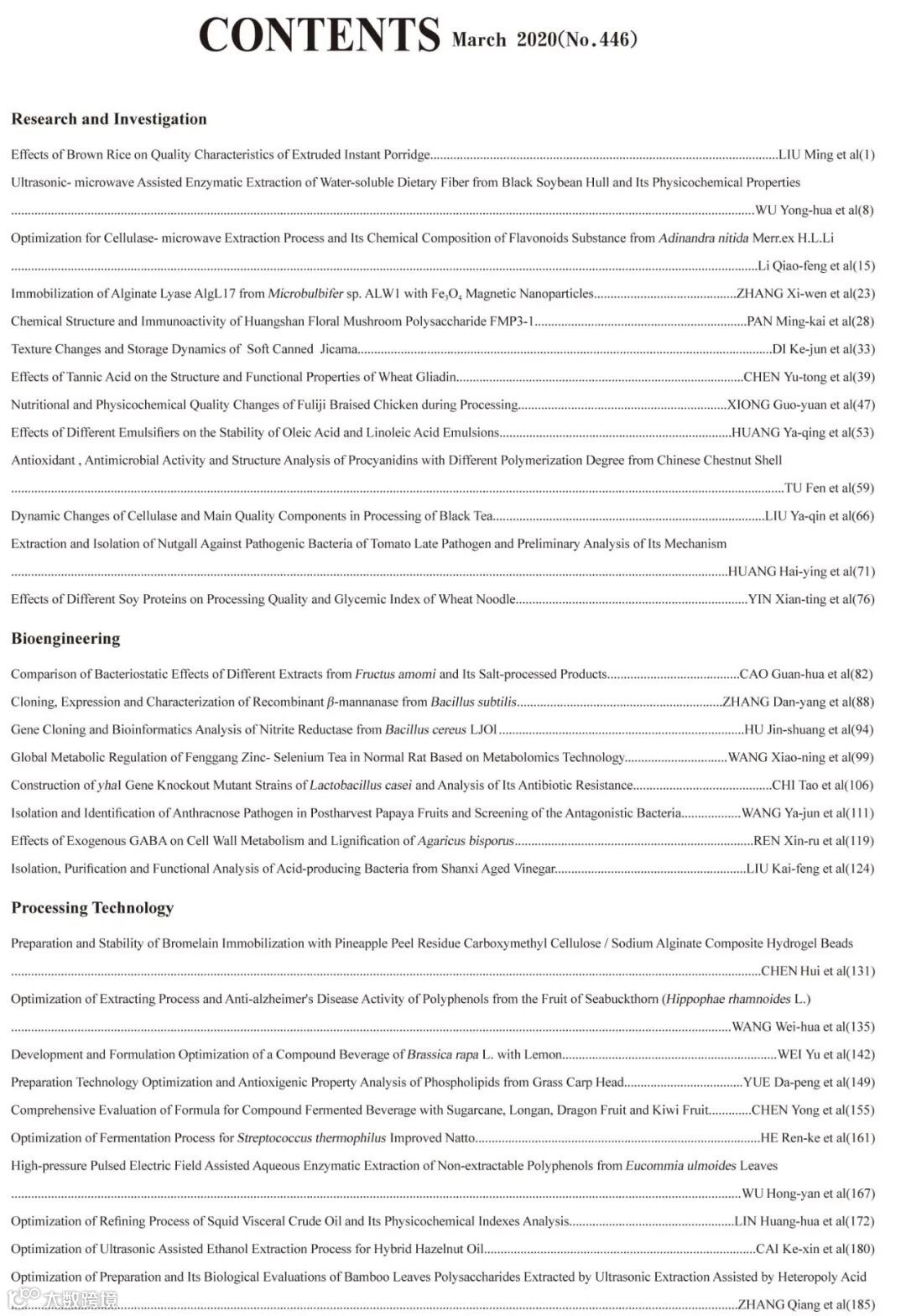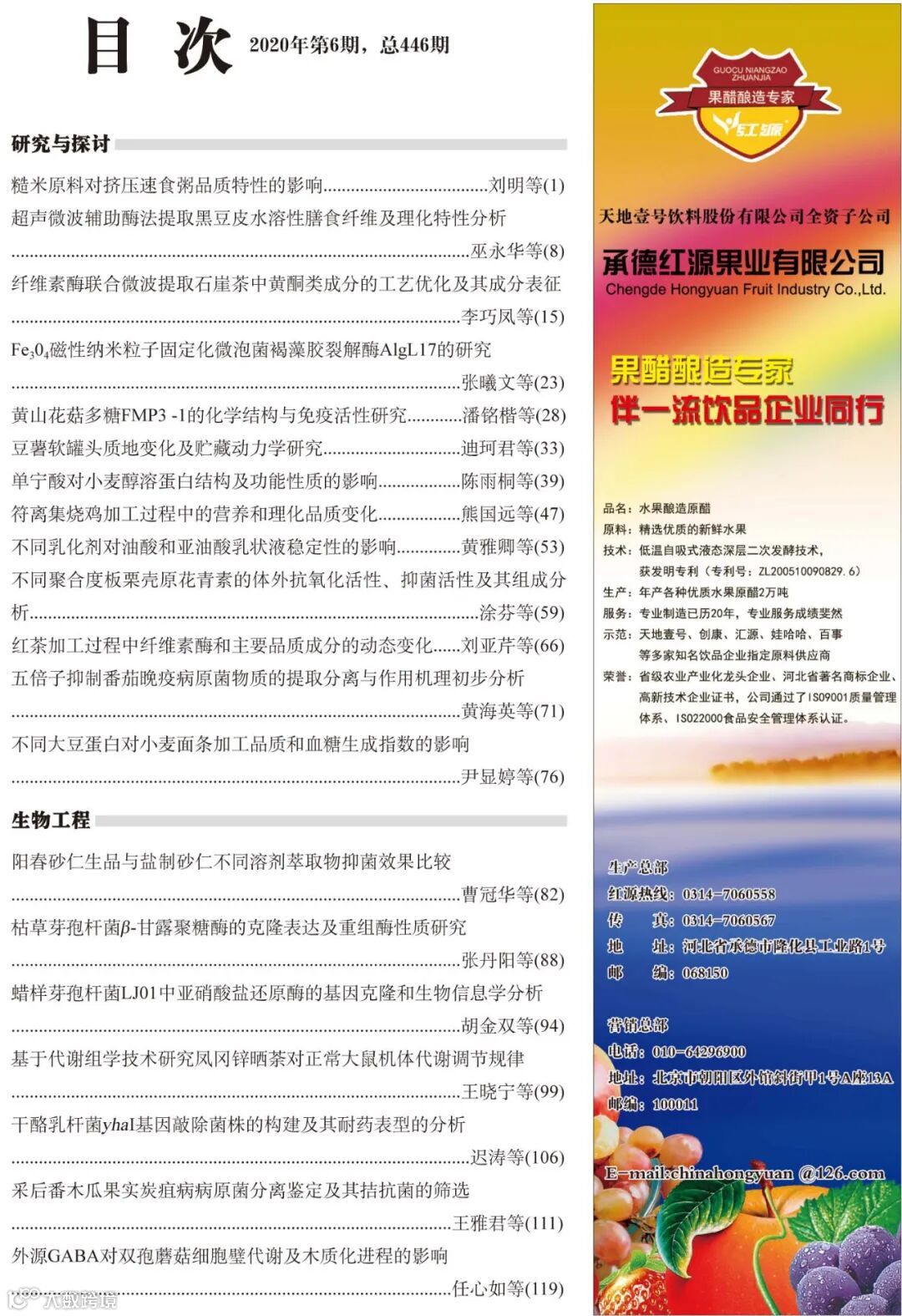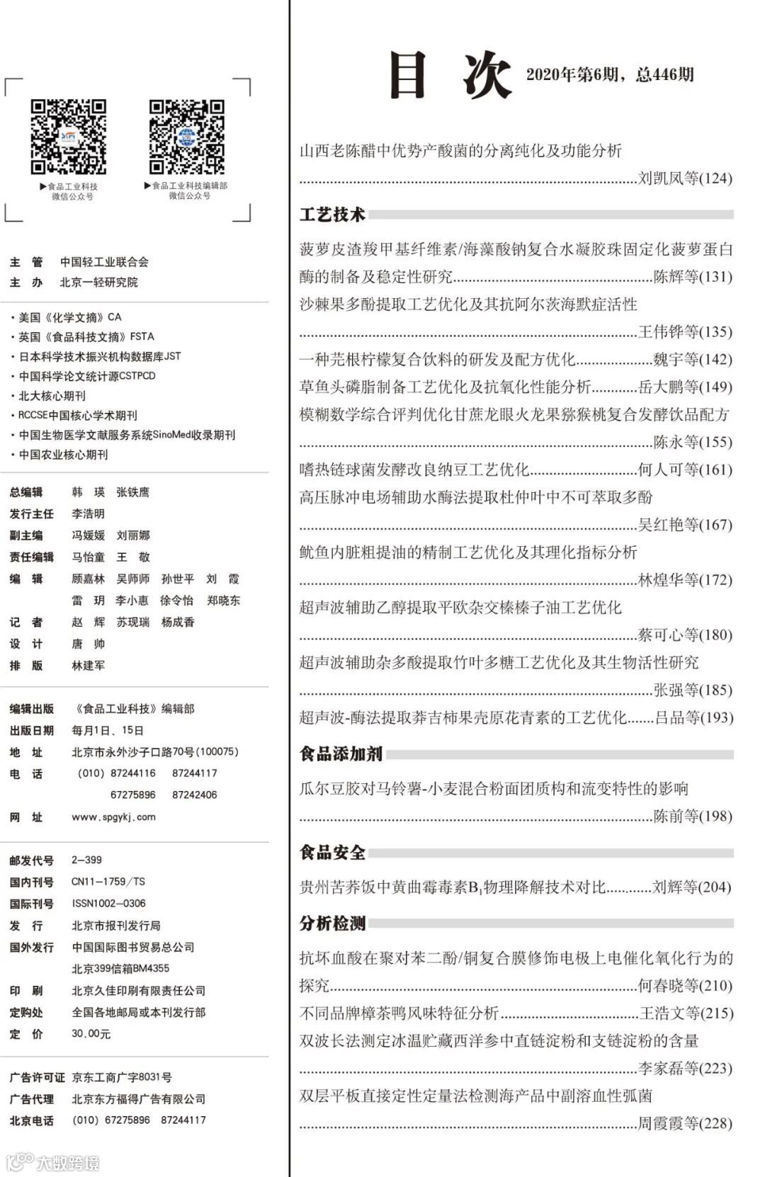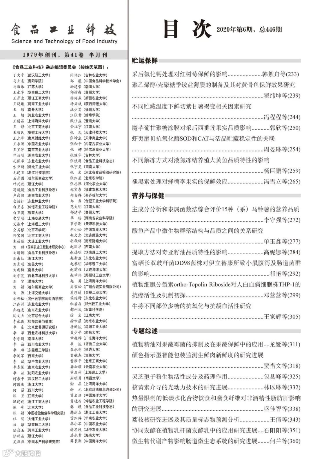 《食品工业科技》2020年41卷第6期封面及目次,