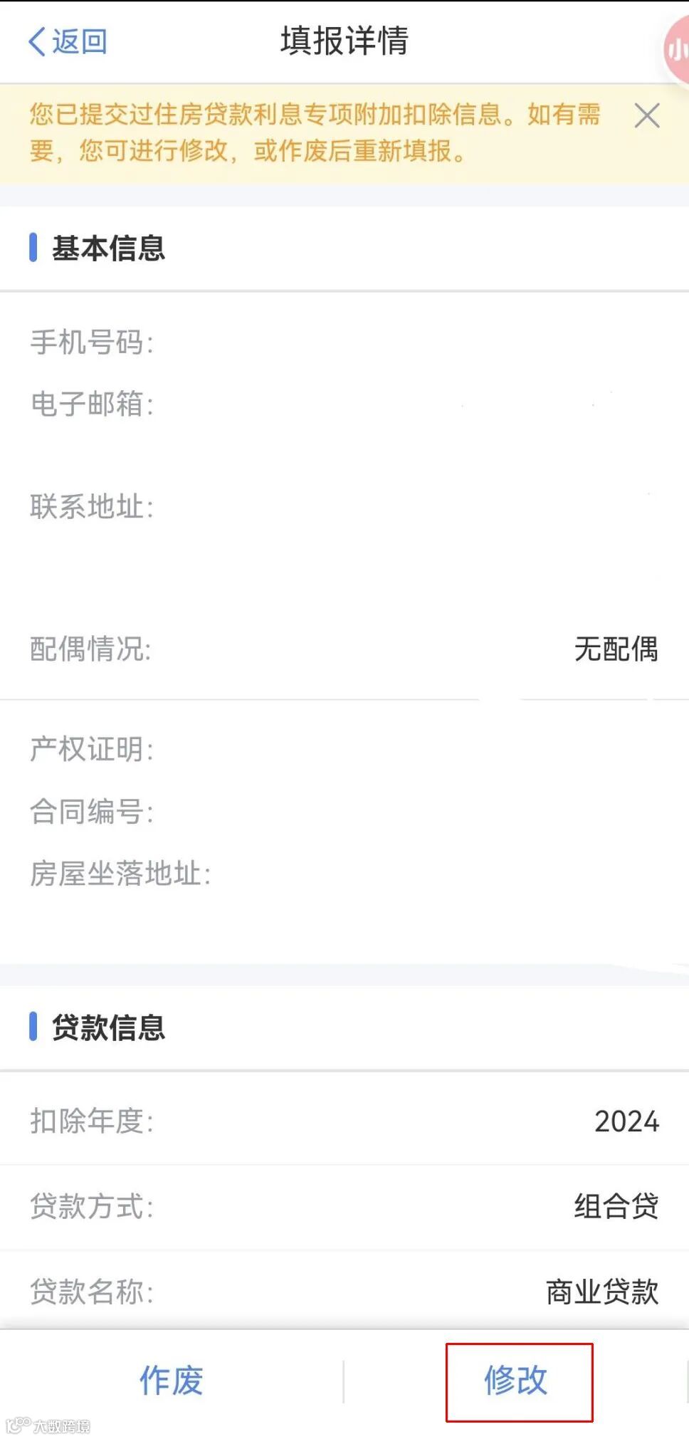 点击底部“首页”——点击重点服务推荐“专项附加扣除”模块的“我要查询”——查询年度修改为“2024”年度——点击查询到的“住房贷款利息”专项附加扣除——点击底部“修改”——选择“修改基本信息”,系统会自动将“配偶情况”修改为“有配偶”,并带入已采集的配偶信息,如无其他需修改的信息,点击“确认修改”即完成修改。