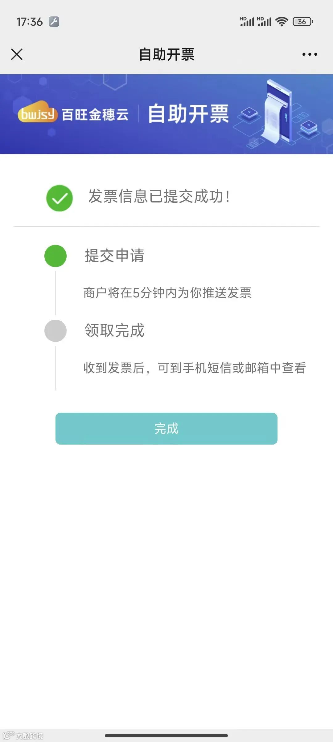 3、提交后开票过程全自动处理,开具成功后自动推送给消费者。