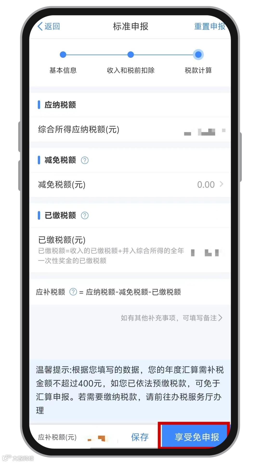 您如果需要补税,但年度综合所得收入不超过12万元,或者汇算需补税金额不超过400元,且依法预缴税额的,可点击享受免申报~