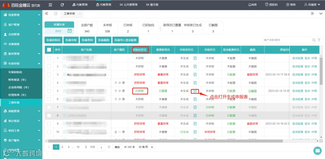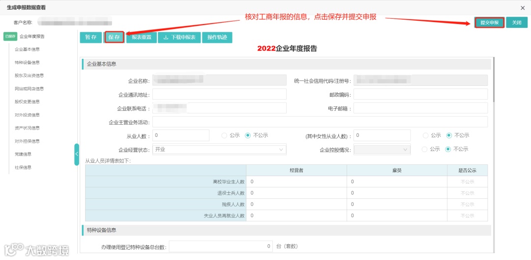 ⑥选择客户,批量初始化后需打开生成申报表核对工商年报的信息是否正确,核对完成后,点击保存并提交申报。如图所示: