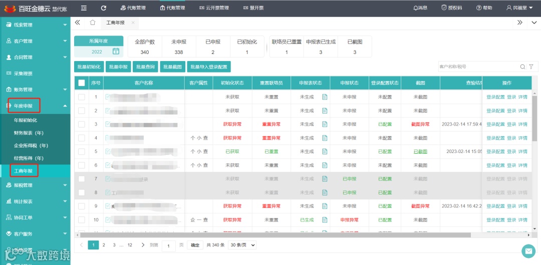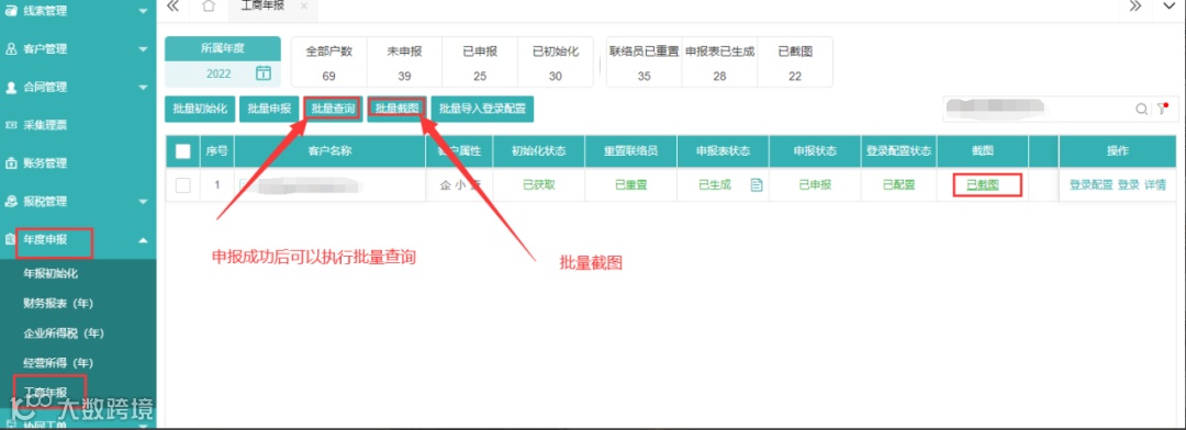 ⑤工商年报功能模块支持【批量初始化】、【批量申报】、【批量查询】、【批量查询】等功能。