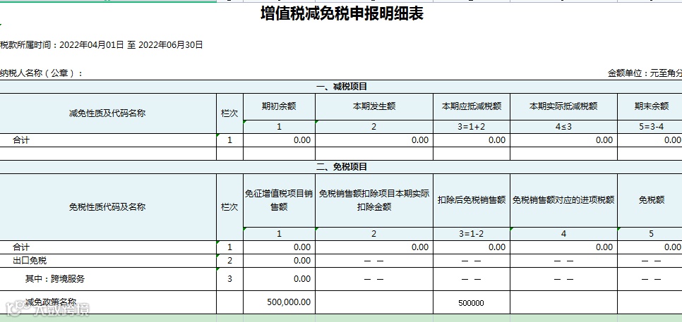 简单扩展,小规模纳税人季度增值税收入总额超过45万,比如收入50万,这50万收入怎么填列呢?在增值税及附加税申报表(小规模纳税人适用)中,全额填列在其他免税销售额,同时填列增值税减免税申报明细表,免税性质代码及名称栏增加并填写即可。如图三所示: