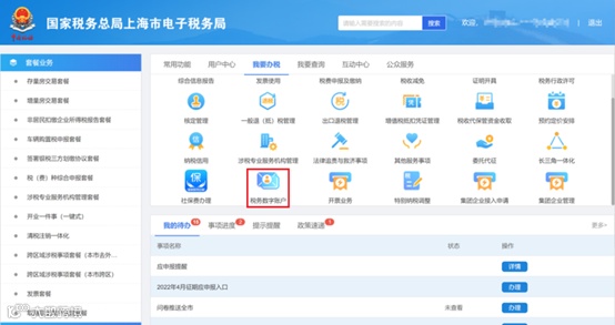 按照国家税务总局工作安排,根据《国家税务总局上海市税务局关于进一步开展全面数字化的电子发票试点工作的公告》(国家税务总局上海市税务局公告2022年第1号),上海市税务局将在前期徐汇区试点的基础上,于2022年6月25日起在全市范围全面试点应用电子发票服务平台税务数字账户,除部分纳税人外,统一通过电子发票服务平台税务数字账户使用发票用途确认、风险提示、信息下载等功能,不再通过增值税发票综合服务平台使用上述功能。