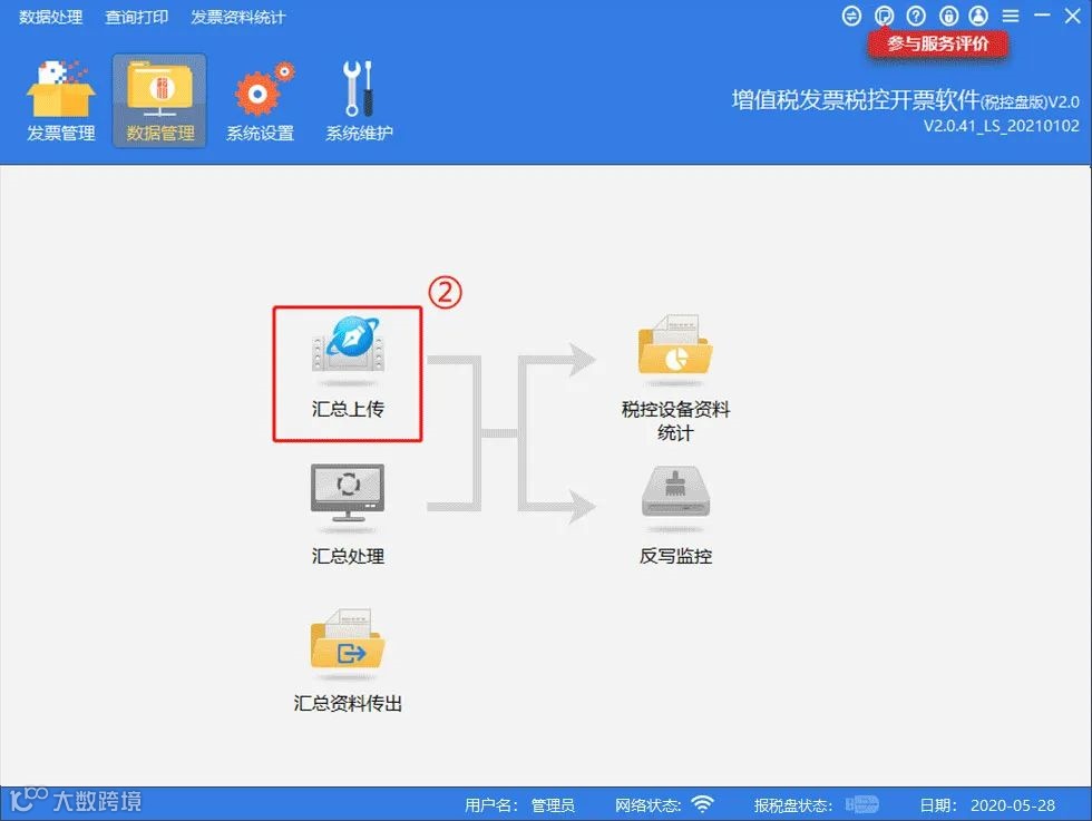 操作流程:点击【数据管理】-【汇总上传】-【上报汇总】。(月初打开软件,在网络通畅的情况下,开票软件会自动上报汇总)。