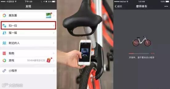 微信联合膜拜单车宣布,膜拜小程序正式上线新功能,用户只需扫一扫进人小程序就可开锁骑车。