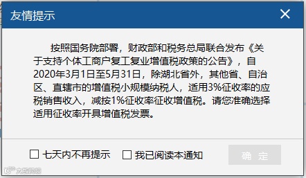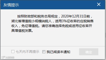 2020年12月31日前,纳税人每次登录增值税发票税控开票软件均需弹出提示信息。纳税人应当勾选“我已阅读本通知”后方可关闭提示框。纳税人可以自主选择“7天内不再提示”。