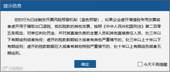 蓝色预警:每张发票开具时或每次登录 开票软件时提醒,同时给出“今日不再提示”的选项。如果选择了,当日(发票开具时或登录开票软件时)不再提示。