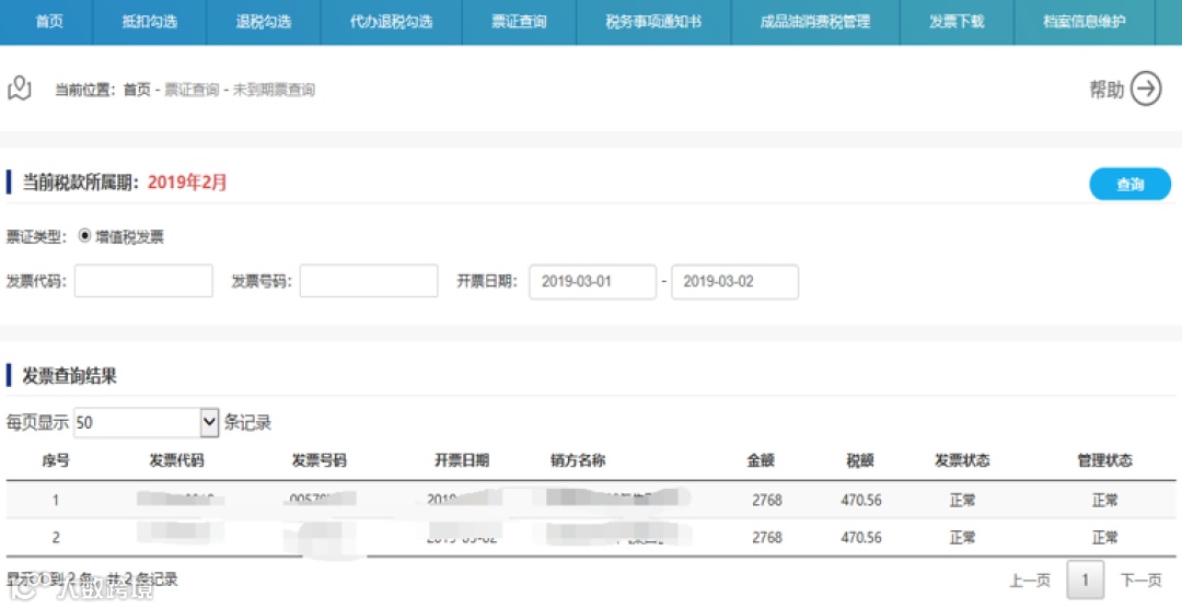 该功能主要向用户提供发票明细的查询功能,分为单票查询、发票查验、未到期发票查询。