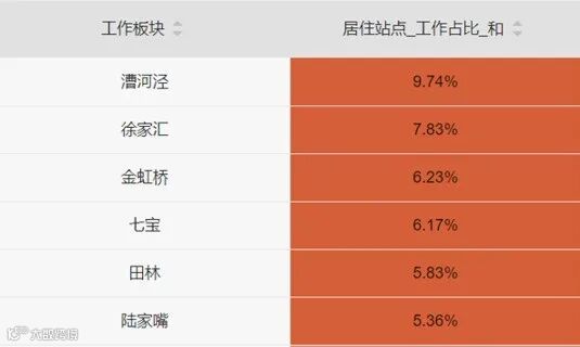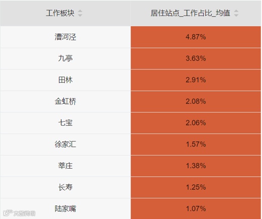 可以看到,1000个居住在松江新城站点周边,地铁通勤人中,有97个在漕河泾、78个在徐家汇工作,金虹桥62个、七宝62个、田林58个、陆家嘴54个,这6个板块的比例超过5%。