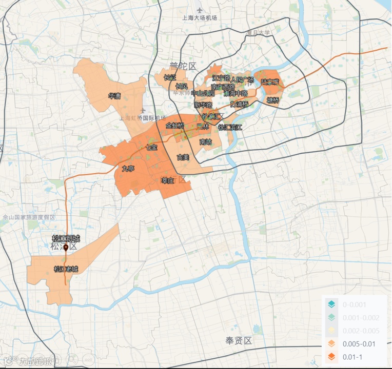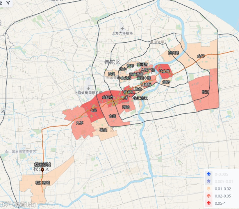 红色系板块:人群累计占比>1%,即1000个居住在松江新城站点周边,坐地铁上班的人,有10个及以上在该板块工作,从图中可以看到,主要围绕9号线沿线分布;