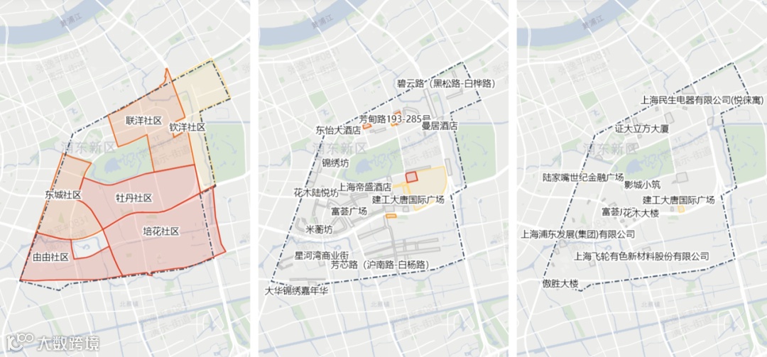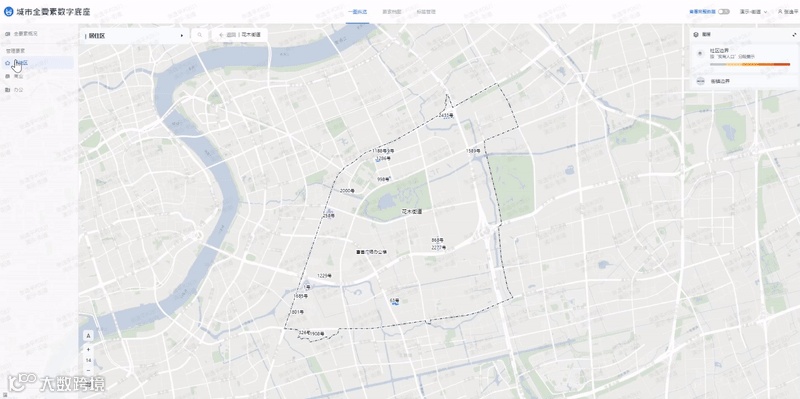 比如,用道路来定义边界划分依据,用边界来明确“分区而治”的人、企、商归属,用区域的颜色来呈现数据的规模与分布,用节点来标记有显著特征的数据位置,用建筑作为标志物来分装全量数据。最终,通过对数据和空间的层层解构,我们可以将最小颗粒度的数据与城市最小单元的空间关联。