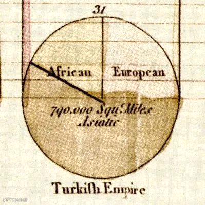 举个例子:在1801年诞生了全世界第一张饼图,阐述的是土耳其帝国当时在欧洲、非洲、亚洲占有的领土面积。在200多年后的今天,我们还用着同样的技术理解数字,比如俄乌战争对各个地区的能源造成的影响。